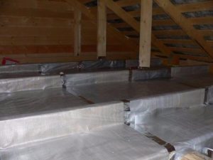 Поскольку пар проникает с нижних этажей, располагайте барьер под финишным покрытием или на перекрытии. Поверхность под укладку материала должна быть ровной. Сначала изготовьте каркас из деревянных планок или профиля, затем в вставьте в него листы внутренней стороной к конструкции. Закрепите их при помощи шурупов.